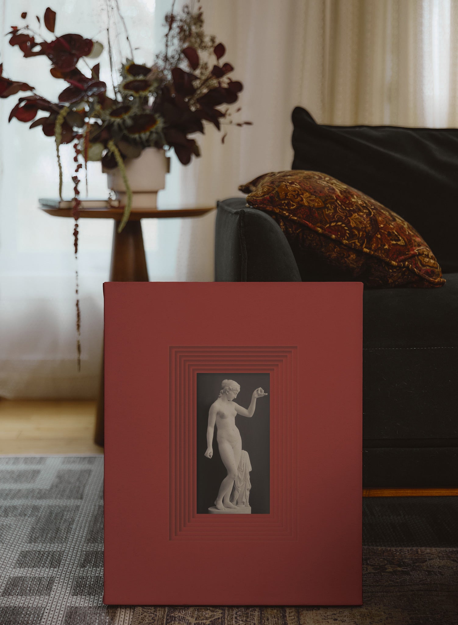 This artwork features a classical nude statue set against a rich, red layered frame, drawing the viewer’s eye immediately to the elegant figure in the center. The delicate sculpting of the statue, combined with the modern framing style, creates a harmonious blend of past and present.