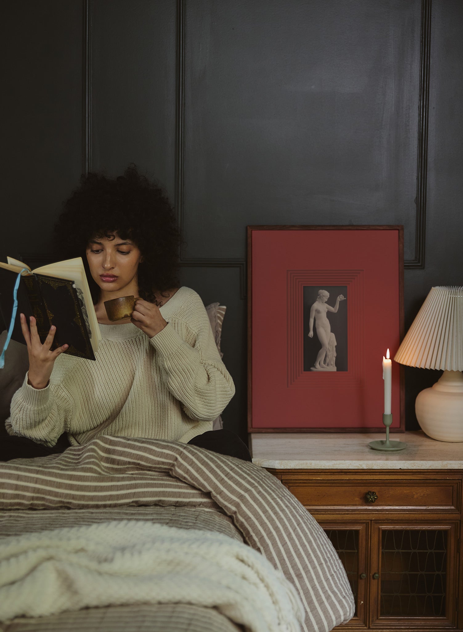 The red frame adds a bold statement, making this piece stand out in any room, while the statue itself remains a symbol of timeless beauty. Perfect for sophisticated interiors, this artwork would complement rooms with bold colors or eclectic decor.